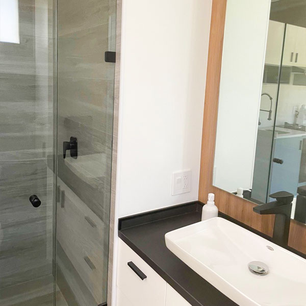 Full-Sized Bathroom featuring a tiled shower with a 3/8" tempered glass door, a 4 drawer Sink vanity cabinet, a linen cabinet, and an all-in-one washer-dryer combo.