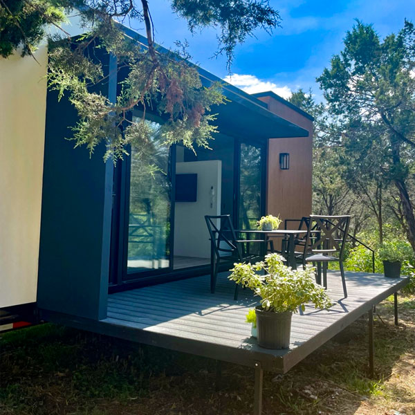 Long-Lasting DECK with TREX decking composite boards over a stiff metal frame, equipped with an electric lift mechanism for added convenience. Staircase included.