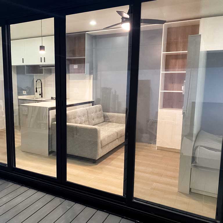 High-end Aluminum Frames featuring double-glazed, tempered sliding doors entry door, and windows.
