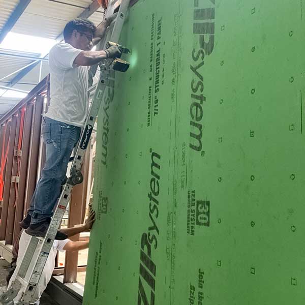 Draped with Zip System panels, providing a hard weather-resistant seal shell.