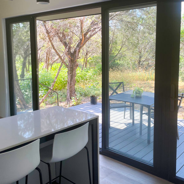 Unique panoramic entry and sliding doors, ( 15 feet long and 7'4" tall ) provide abundant natural light and views, seamlessly integrating the living area with the deck.