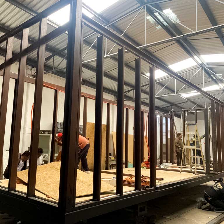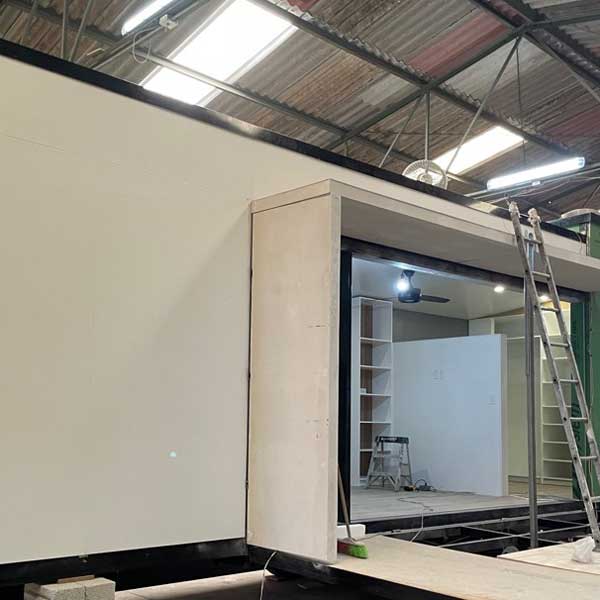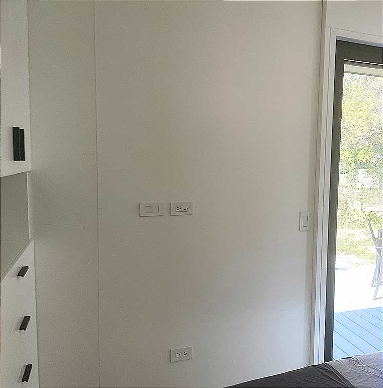 Interior walls and ceiling finished with MDF panels coated in a satin polyurethane finish.