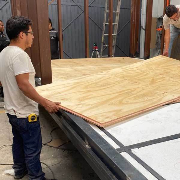 Plywood Sub-floor over R25 high density Polystyrene foam planks.